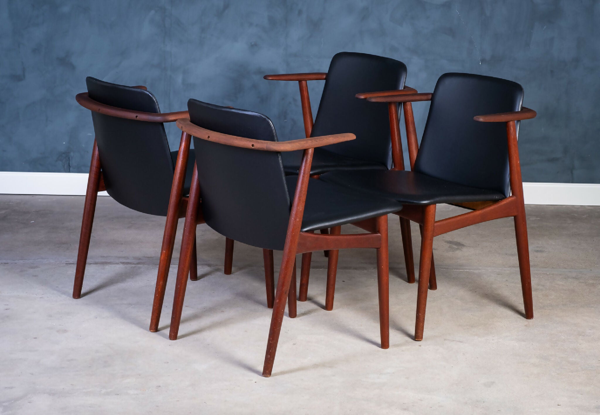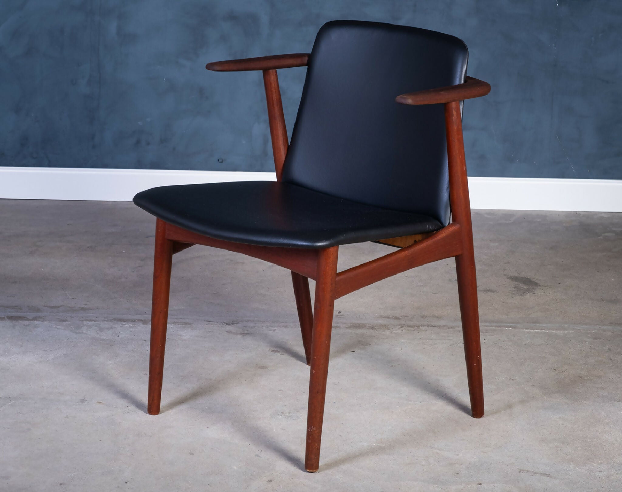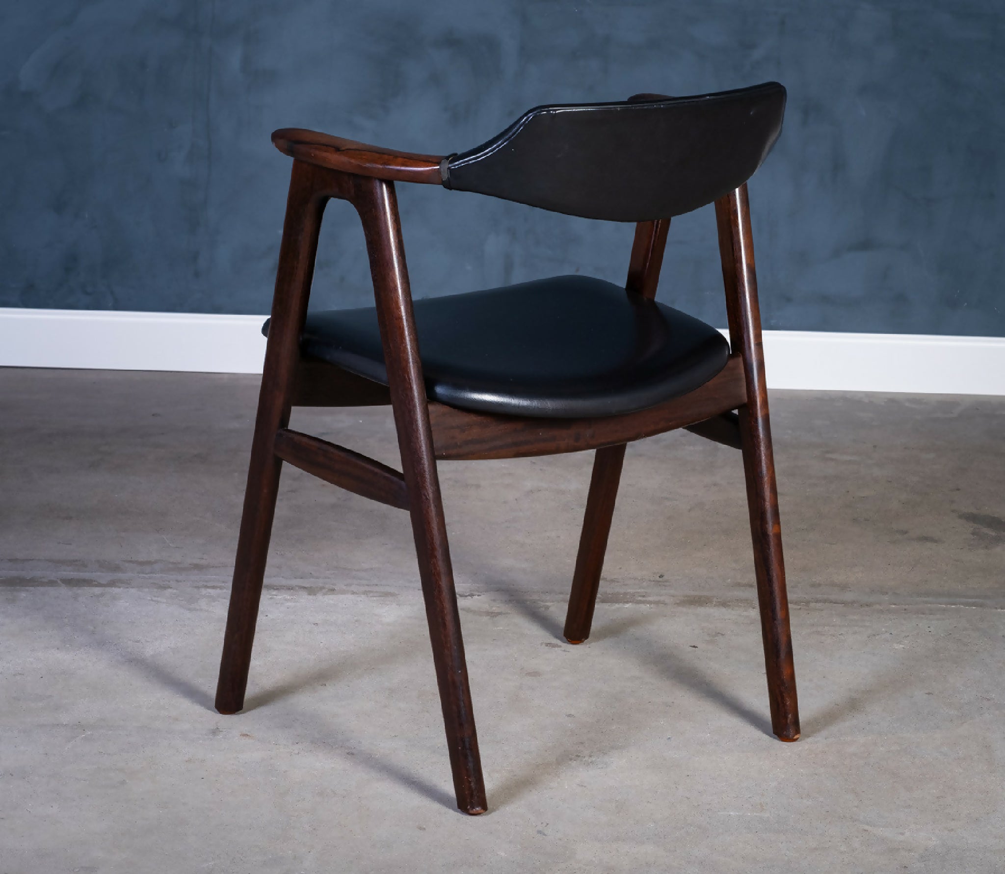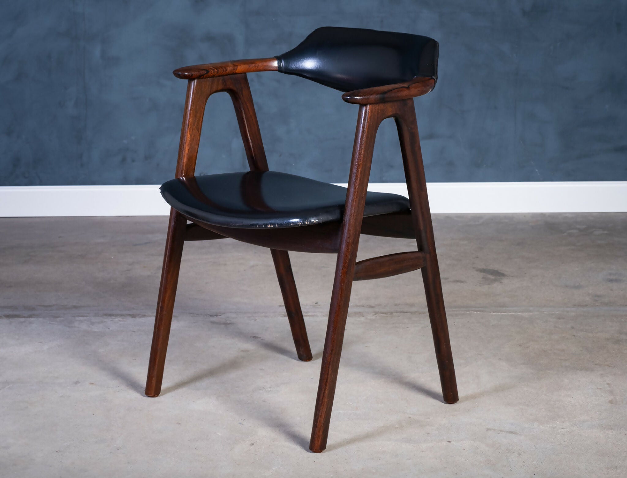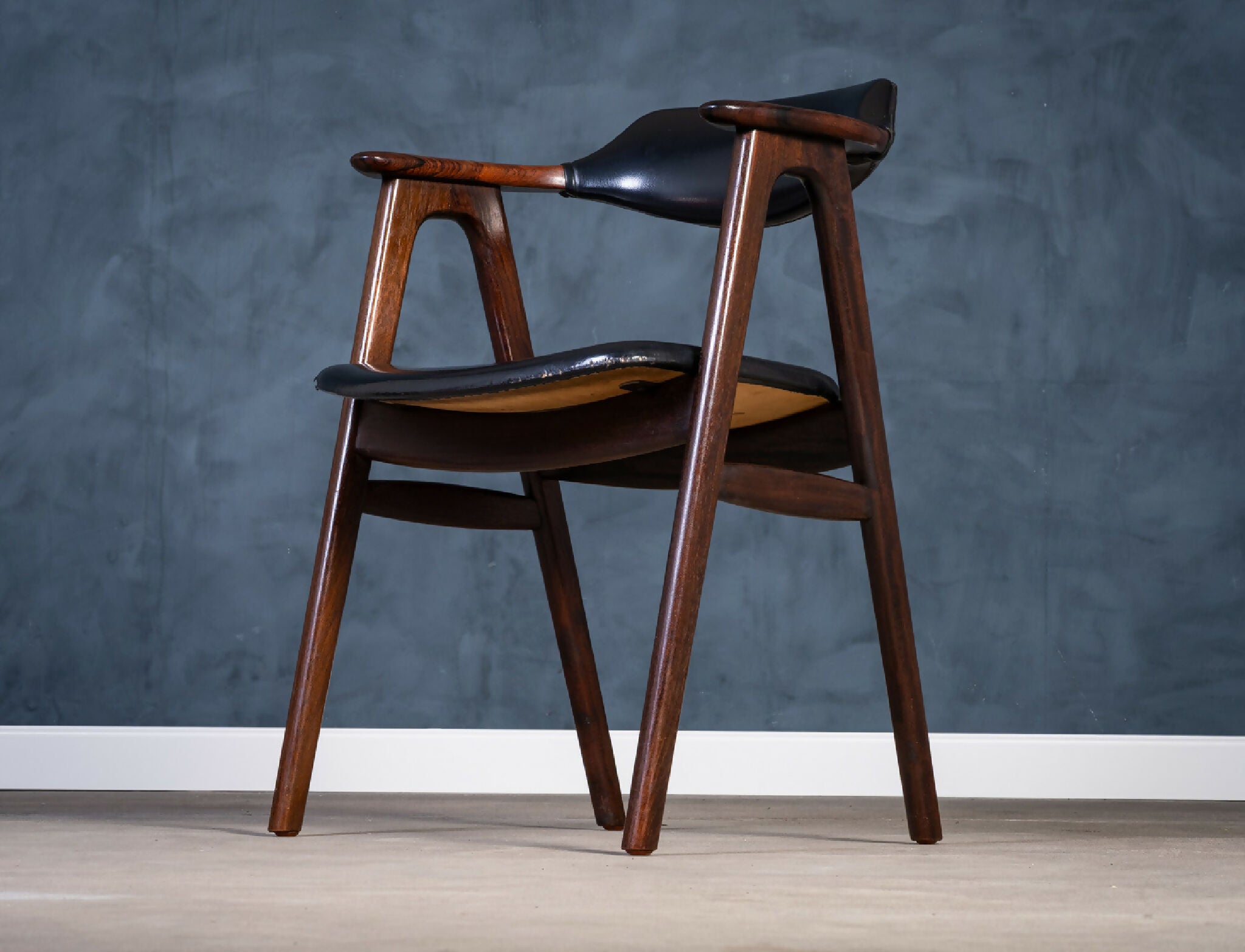 Model armchair designed by Erik Kirkegaard for Høng Stolefabrik in the 1960s. The chair is made of solid rosewood with a black upholstered seat and characteristic curved back, which provides both comfort and an elegant, organic expression. The design is characterized by Kirkegaard's ability to combine sculptural lightness with functionality - a fine example of the Danish furniture tradition from the period.